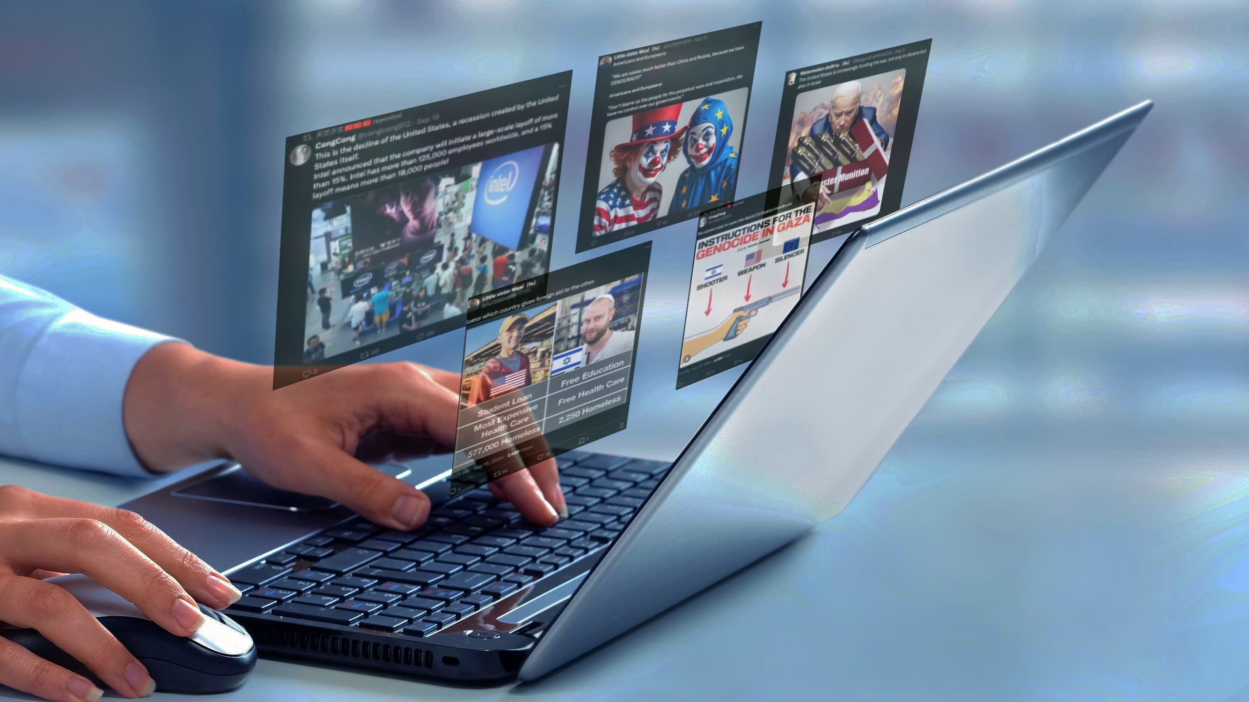 美国的各类社会问题都成了“垃圾伪装”炒作的重点,包括美国的无家可归现象、毒品滥用、种族歧视、贫富不均等。“垃圾伪装”也攻击美国的外交政策,特别是华盛顿对乌克兰和以色列的支持。