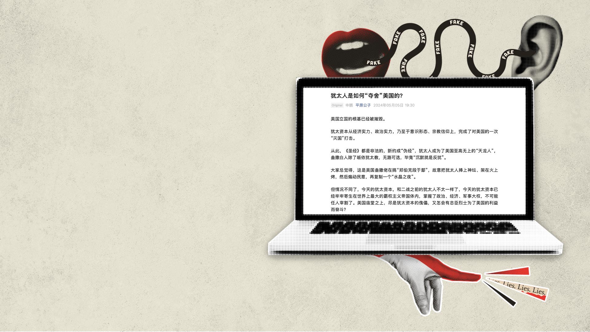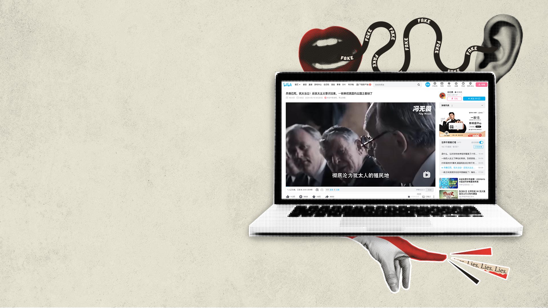 在哔哩哔哩上, 有视频谎称美国通过了法律“严禁任何美国人‘反犹’,否则将会依法遭到抓捕”。在微信上,一篇文章指控犹太人“靠渗透、靠联姻、靠政治献金和集团游说,最终完成了对美国政坛的控制”。