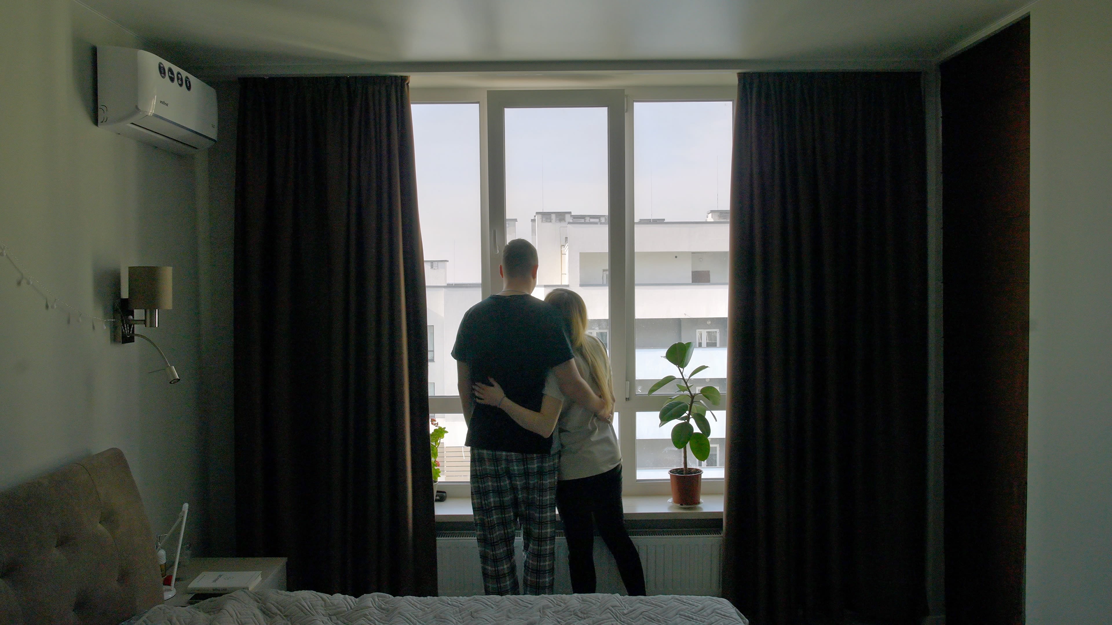 Viktoria y su esposo contemplan el horizonte desde su apartamento a las afueras de Kiev.