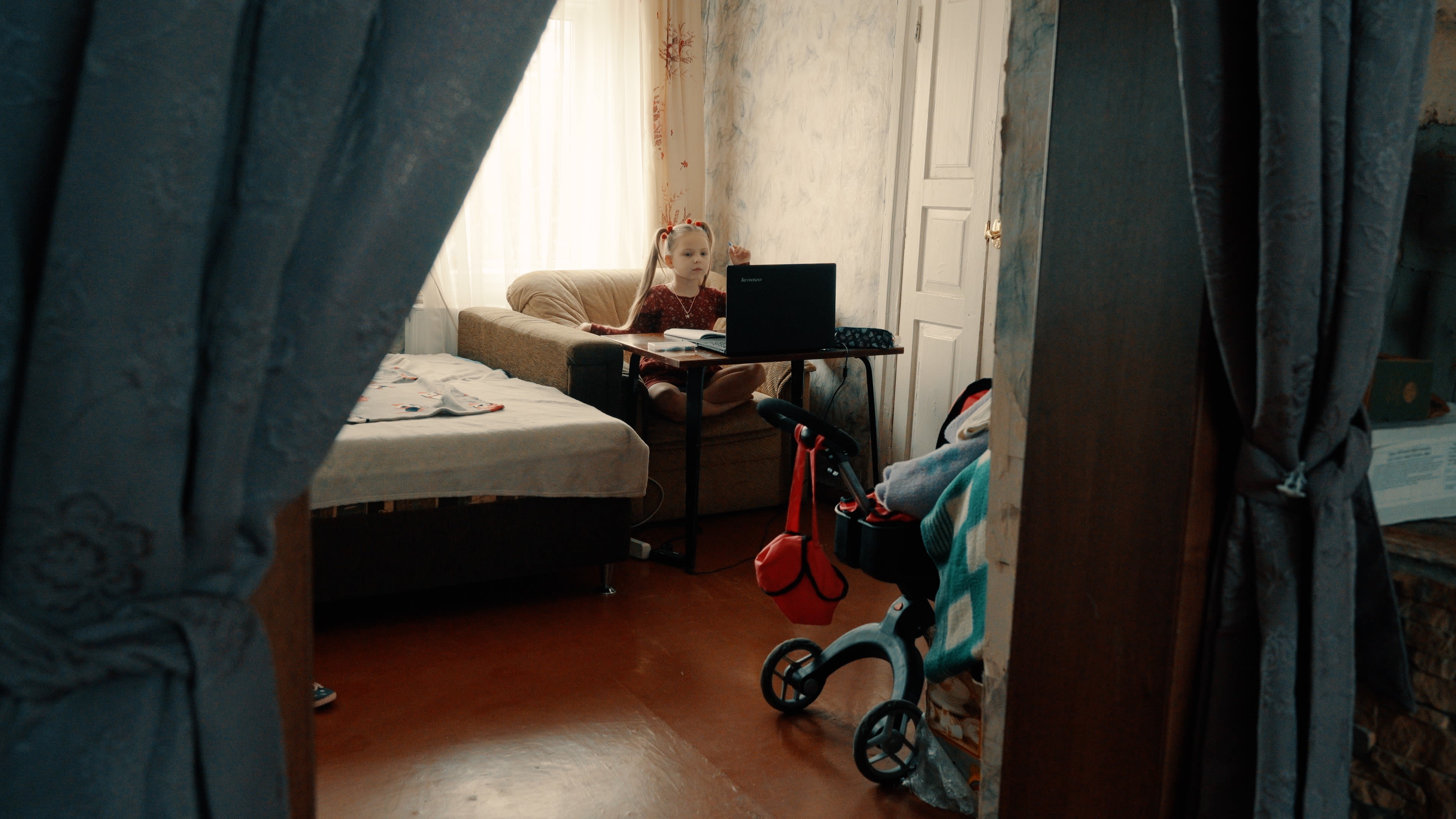 Yana, la madre de la pequeña Arina, intenta que su hija de 7 años no deje de sonreír. Lo hace incluso cuando los ruidos de la guerra los atemorizan a todos. Su propósito es difícil de conseguir, especialmente mientras los misiles detonan constantemente a lo lejos y los drones sobrevuelan cada cierto tiempo.