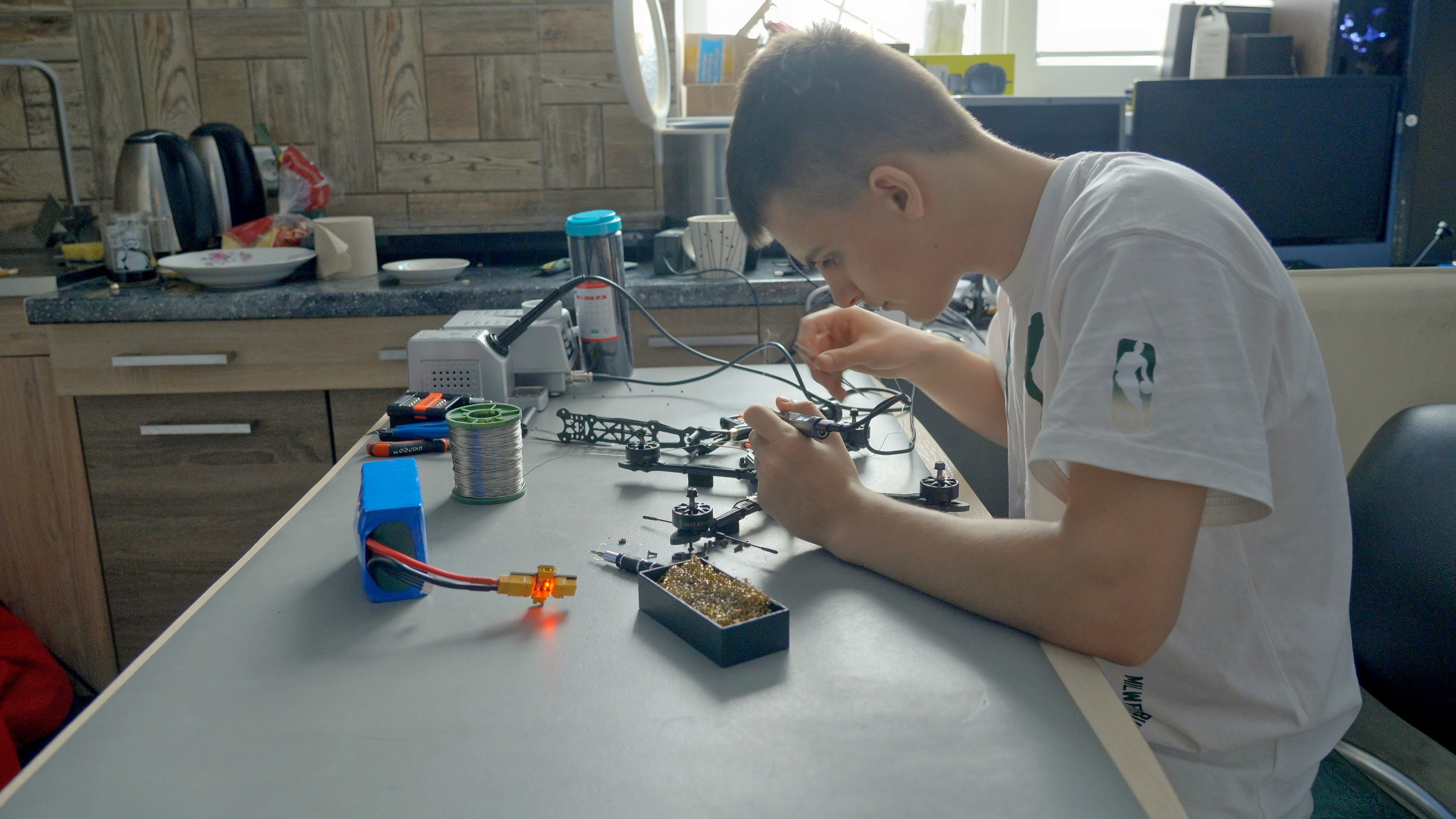 Este adolescente, hijo de un militar ucraniano de carrera, vive en una especie de confinamiento voluntario. Animado y apoyado por su padre, comenzó a construir drones para el ejército de Ucrania poco después del inicio de la invasión a gran escala de Rusia.