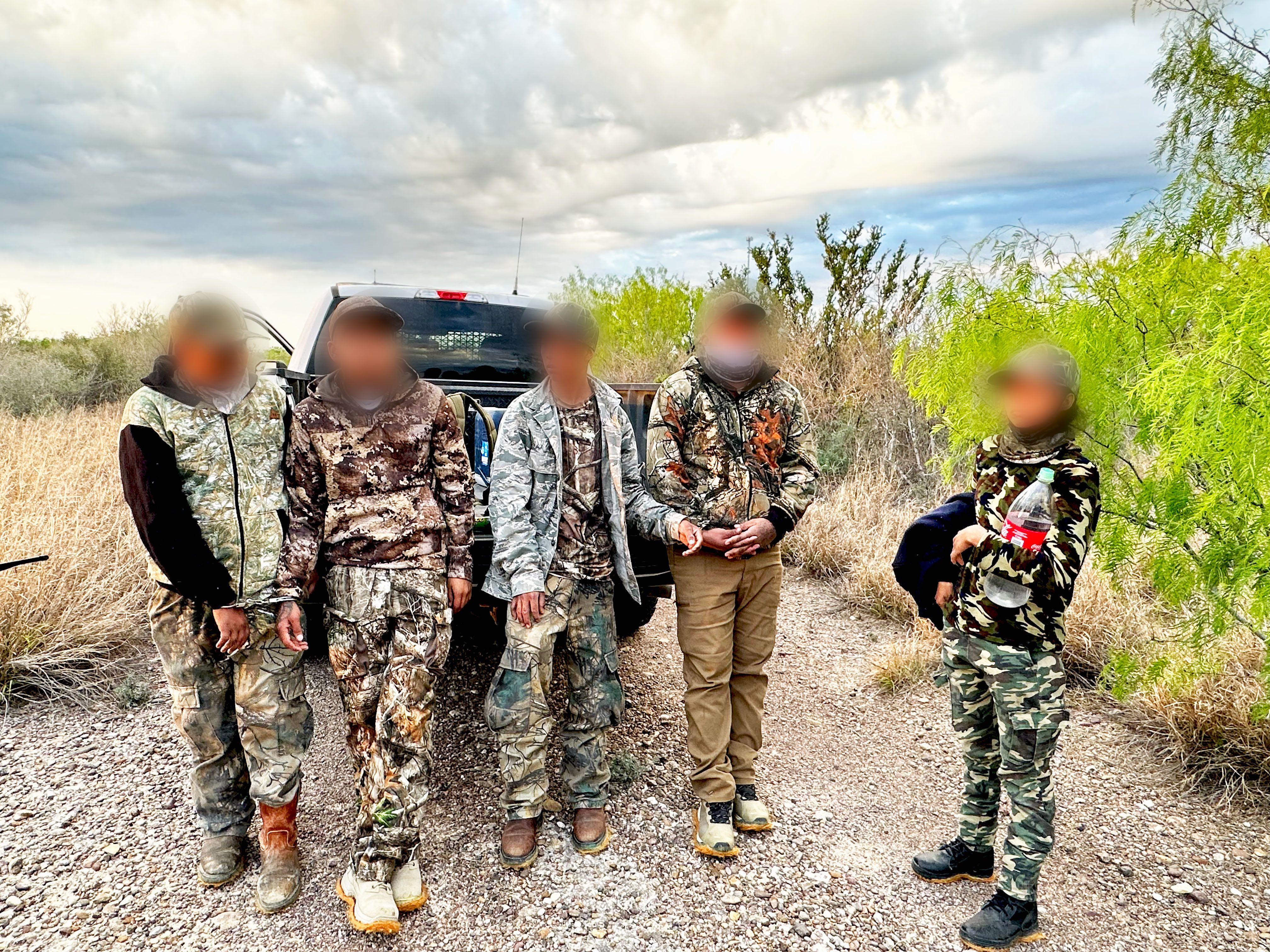 Hombres detenidos tras cruzar a Estados Unidos por puertos. Llevan ropa de camuflaje para poder mimetizarse entre la vegetación de la zona y evitar ser vistos por las autoridades migratorias. Cortesía.