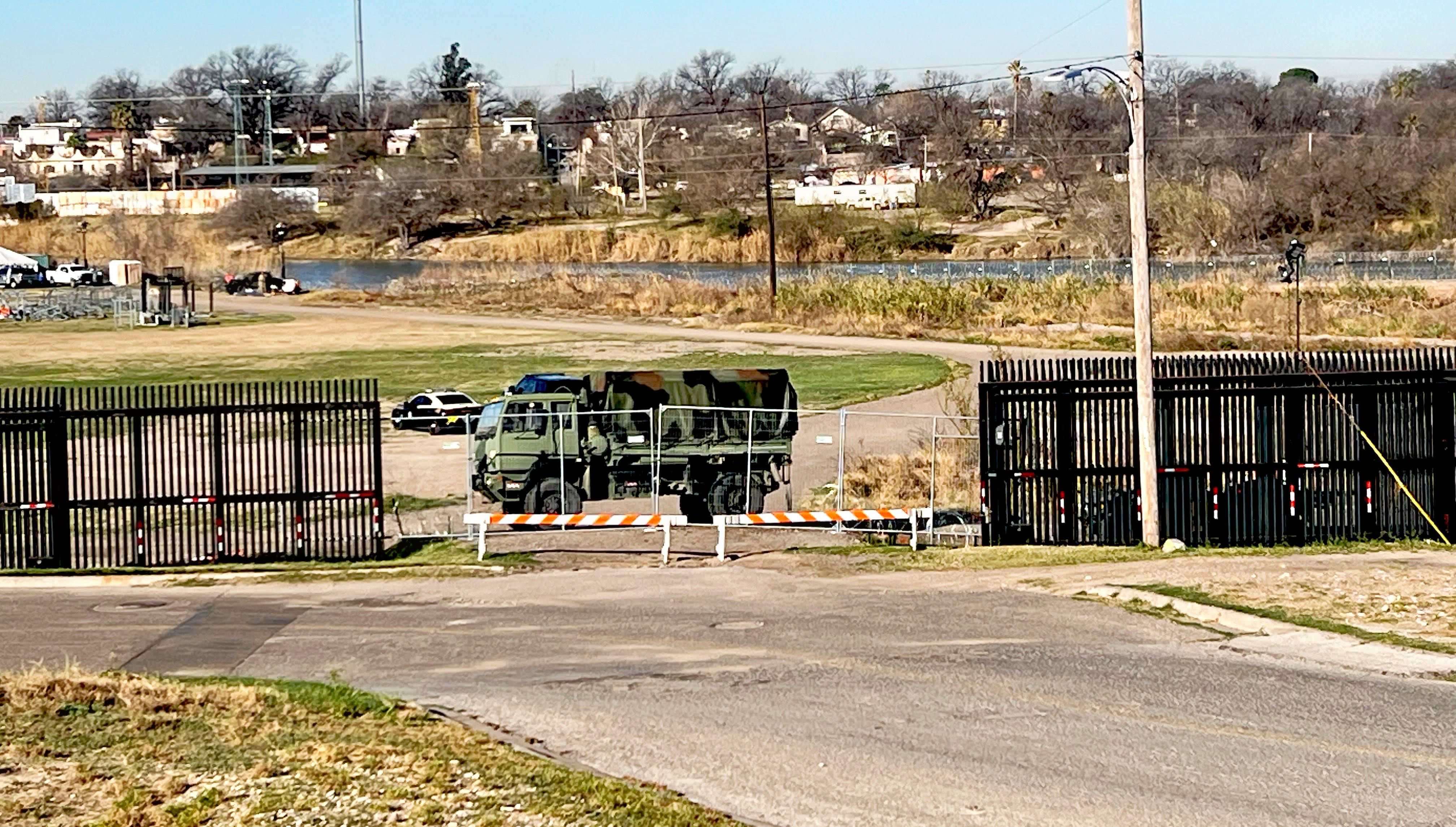 Camiones del Ejército de Texas bloquean el ingreso a Shelby Park, en Eagle Pass. Esta es una forma de regular el acceso a la zona. Laura Sepúlveda (Voz de América)