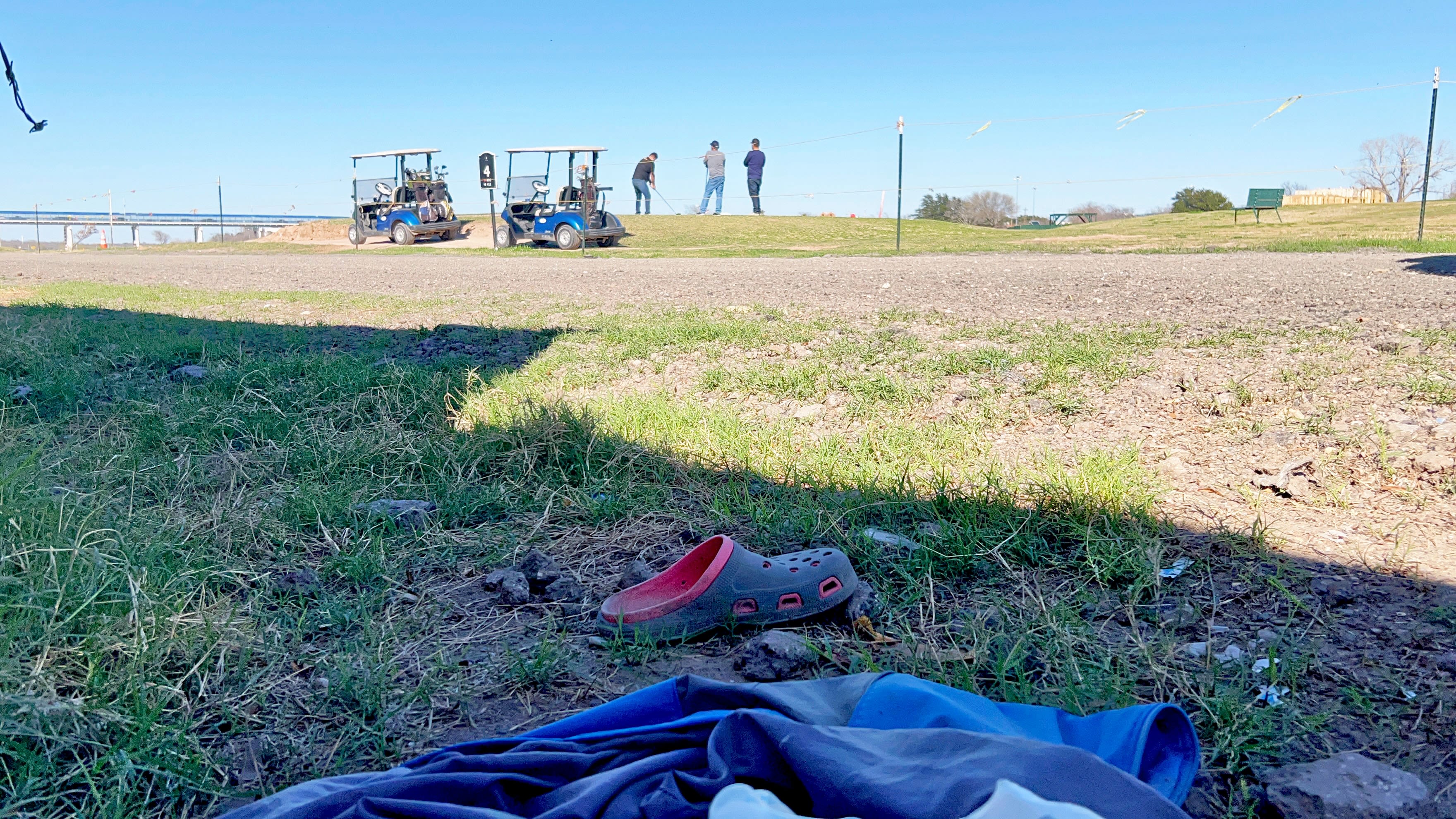 Objetos dejados por migrantes durante el paso por puertos irregulares. Al fondo aparecen residentes de residente de Eagle Pass jugando golf. Foto: Laura Sepúlveda, Voz de América.