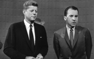 On September 26, 1960, the two major party presidential candidates debate live on television for the first time in US history. Democrat John F. Kennedy, a Massachusetts senator, and US Vice President Richard M. Nixon, a Republican, face off in Chicago. Nixon appears nervous and perspires heavily during the event, while Kennedy, who goes on to win the election, appears more at ease. |