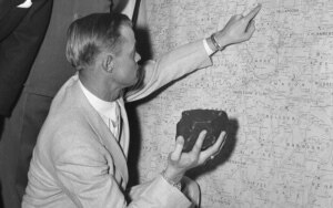 On November 30, 1954, the first modern record of a meteorite striking a human occurs in Alabama, when an 8.5-pound space rock slams through the roof of a house. The meteorite crashes into the living room and bounces off the radio before hitting a woman on the hip. The victim, who is sleeping on a couch at the time of impact, is not seriously injured, but she does end up with a nasty bruise along her hip and leg. (Photo: An attorney for the woman hit by the meteorite holds the space debris.) |