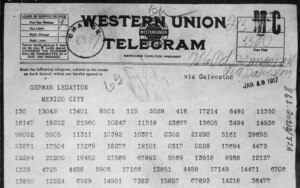 On February 24, 1917, British officials give U.S. officials the Zimmerman Telegram. The intercepted telegram from the German Foreign Office to the Mexican government proposed an alliance between Mexico and Germany should the U.S. enter World War I. Specifically, Germany offered to give Mexico Texas, New Mexico and Arizona, territory Mexico lost to the U.S. after the Mexican-American War in 1848. While the German sinking of several U.S. ships had been shifting public opinion toward entering the war, the Zimmerman Telegram was the final straw. The U.S. declared war on Germany on April 6, 1917. |